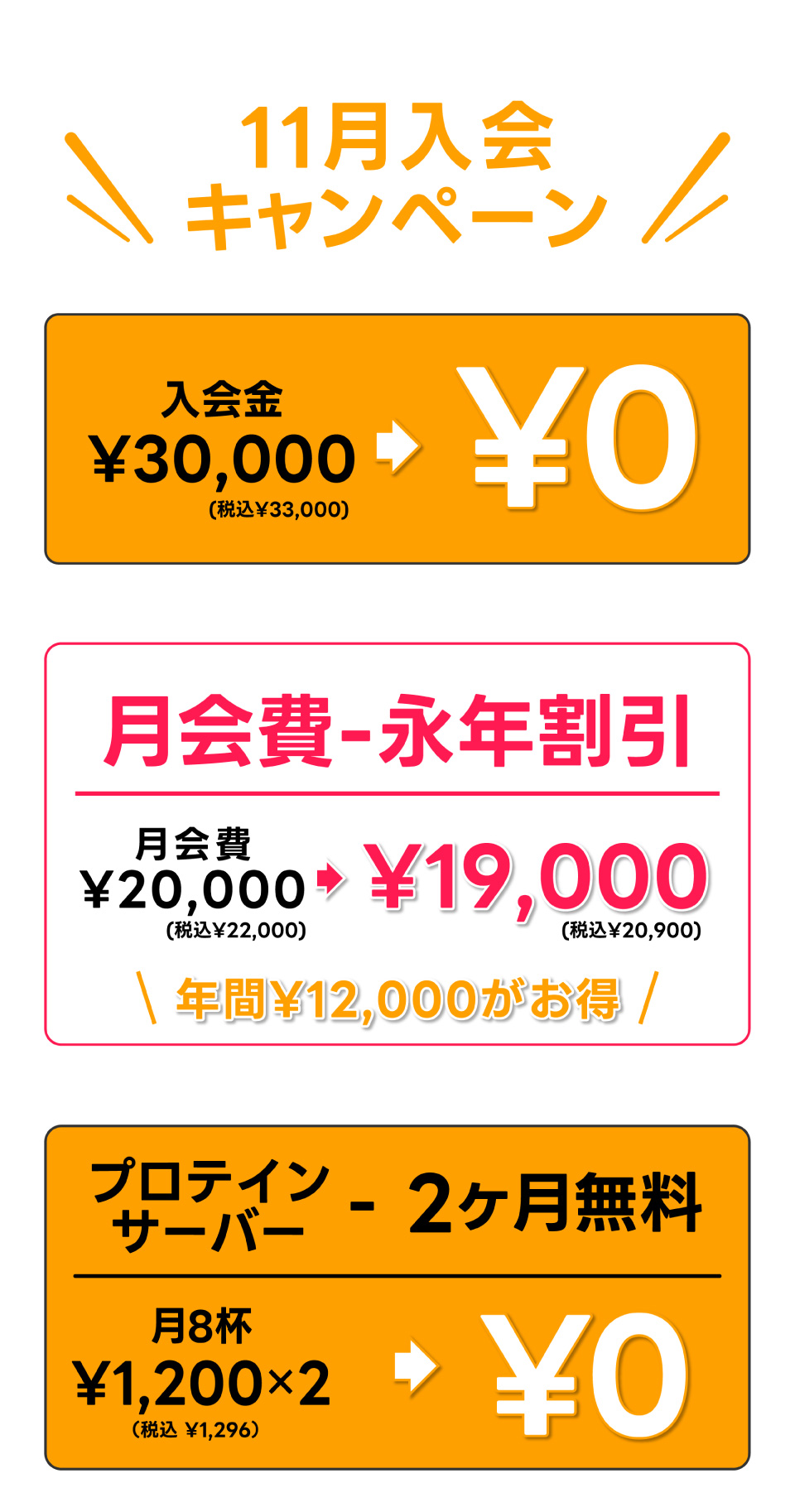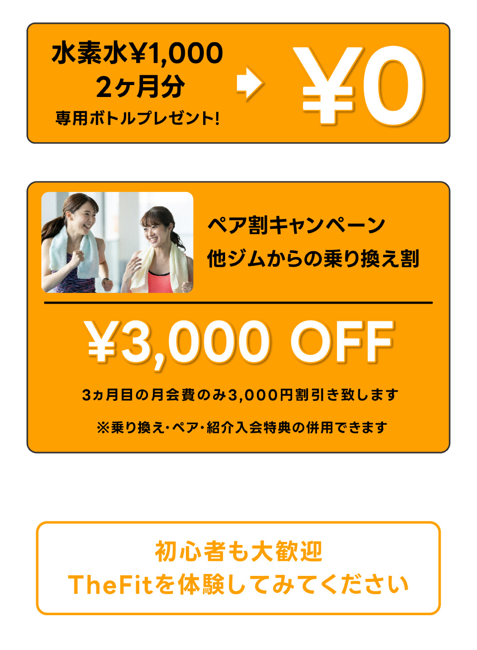 ・乗り換え/紹介/ペア入会で 月会費3,000円OFF(3ヶ月目に適用)