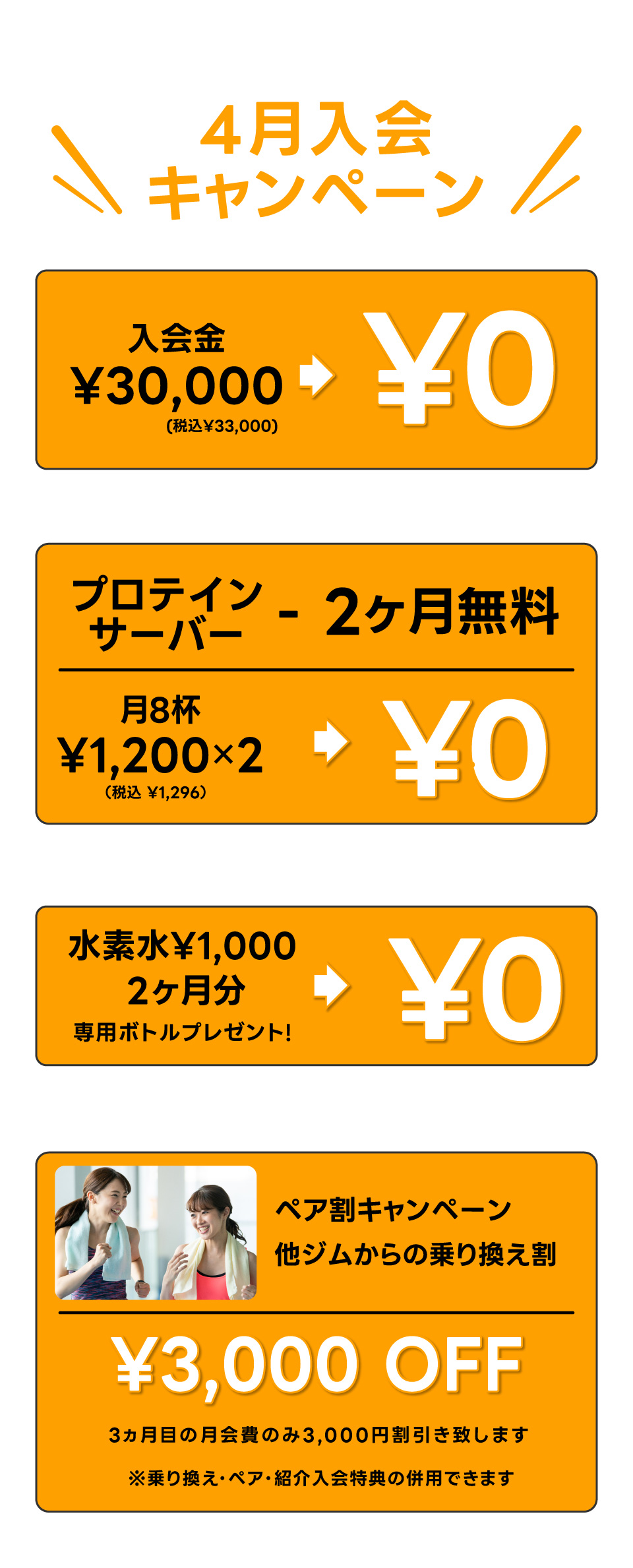 ・乗り換え/ペア入会で 月会費3,000円OFF(3ヶ月目に適用)