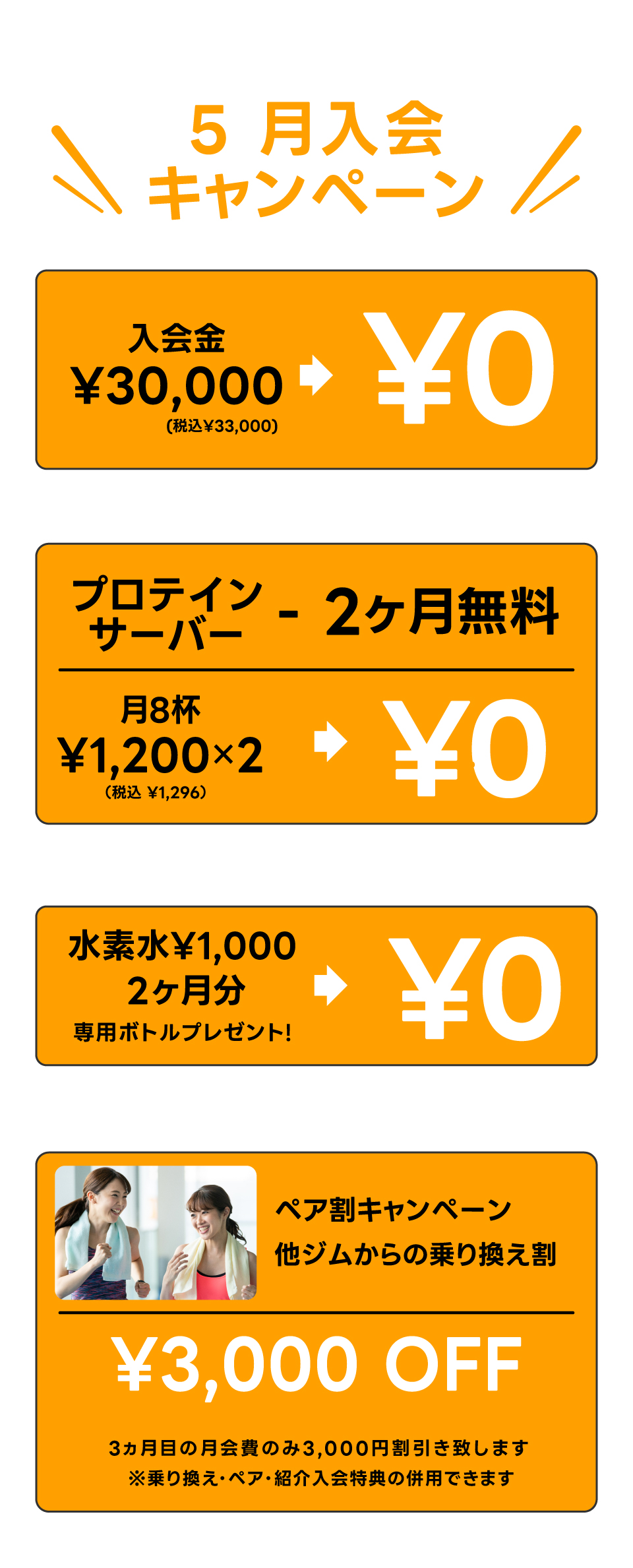 ・乗り換え/ペア入会で 月会費3,000円OFF(3ヶ月目に適用)